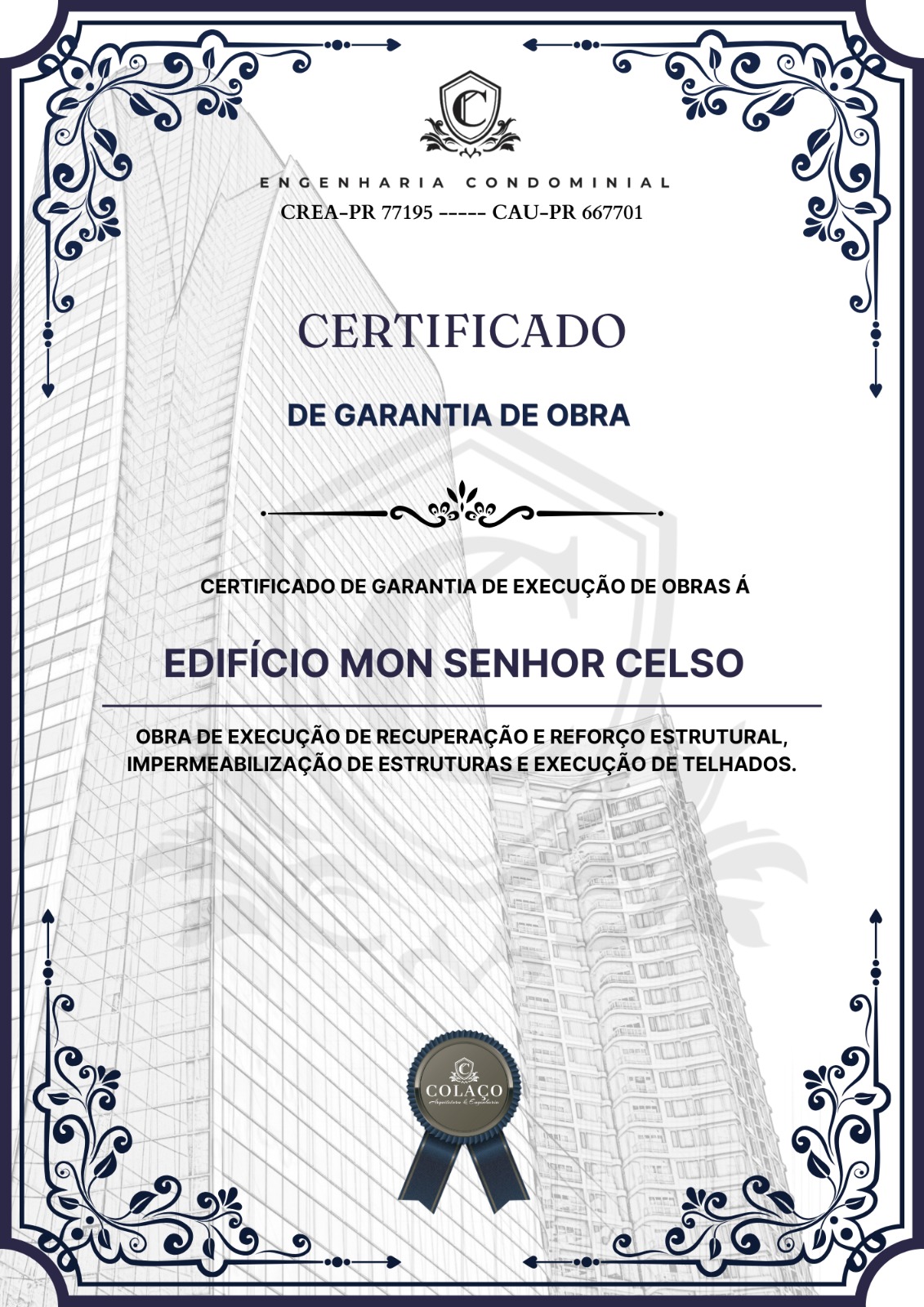Somos uma empresa de engenharia registrada no CREA-PR nº 77195 e CAU-PR nº 667701, sediada em Curitiba, com atuação desde 2014 na execução de projetos e obras para condomínios residenciais e comerciais. Unimos técnica, inovação e responsabilidade para entregar obras seguras e de alta qualidade.